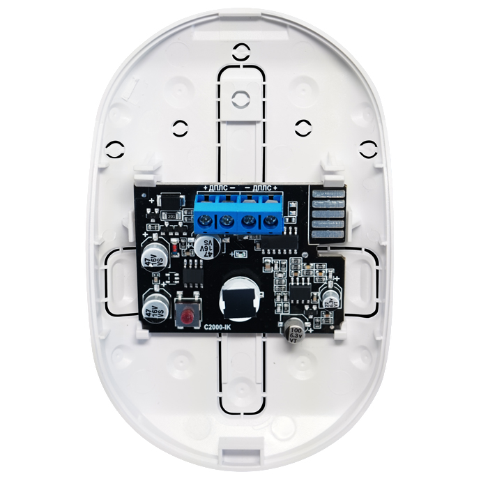 С2000-ИК исп.02 – охранный извещатель, объёмный оптико-электронный адресный. Работает с контроллером С2000-КДЛ, к одному контроллеру можно подключить до 127 извещателей. Извещатель не срабатывает при перемещении животных до 10 кг, перепадах фоновой освещенности и в условиях конвективных тепловых потоков. Встроена защита от электромагнитных полей и воздействия импульсов напряжения по линии связи. Корпус контролируется на вскрытие. Есть возможность управления режимом индикации. Адрес извещателя запоминается энергонезависимой памятью. К одному контроллеру С2000-КДЛ можно подключить до 127 извещателей.
