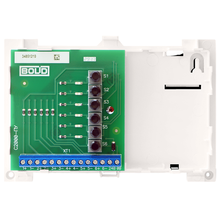 С2000-ПУ – пульт управления для совместного использования с приёмно-контрольными приборами (например, СИГНАЛ-20, СИГНАЛ-20П и С2000-4), формирует сообщения о нарушении радиальных ШС, управляющих установками пожарной автоматики, вентиляции и другими устройствами. На лицевой панели находятся 6 переключателей с двумя положениями, 6 светодиодных индикатора отображающих состояние ШС. Пульт крепится двумя болтами к стене.