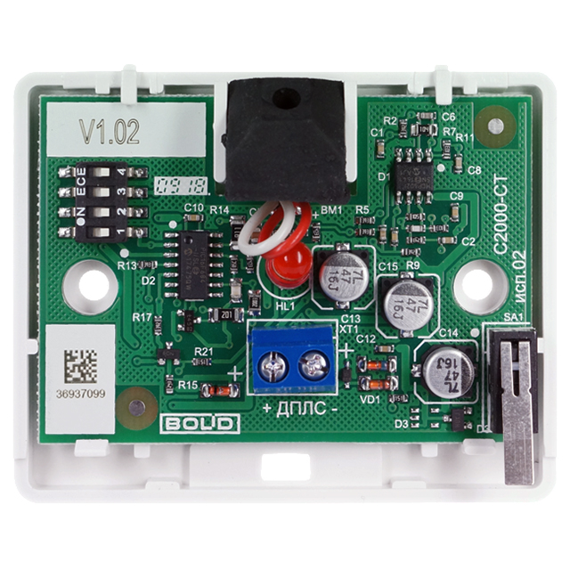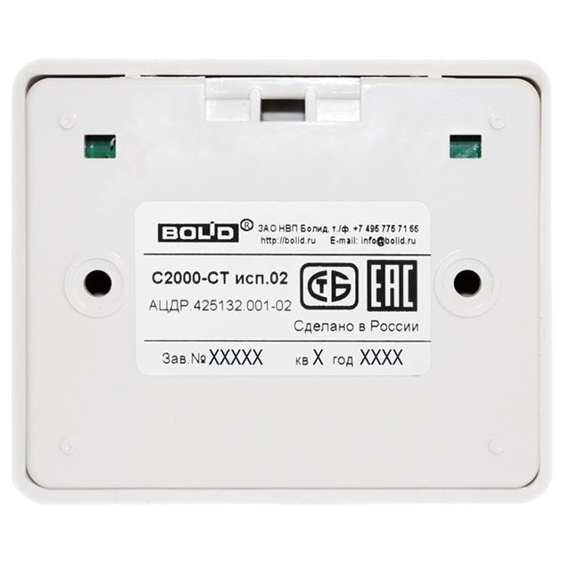 С2000-СТ исп.02 – извещатель предназначен для обнаружения разрушения обычного стекла марок М4-М8 по ГОСТ 111-90 и покрытого защитной полимерной пленкой, обеспечивающей класс защиты А1-А3 по РД 78.148-94 МВД России, стекол толщиной от 2.5 до 8 мм площадью не менее 0.1 м² (при длине каждой из сторон не менее 0.3 метра). Применяется с контроллером С2000-КДЛ или С2000-КДЛ-2И.