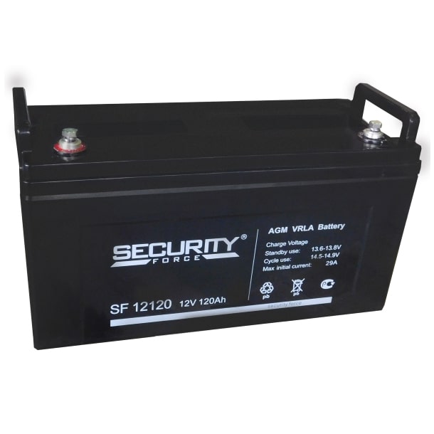 SF 12120 – стационарный свинцово-кислотный необслуживаемый аккумулятор 120Ач 12В, созданный специально для охранно-пожарных систем, изготовлен по технологии AGM. Рекомендован для использования в слаботочных системах и оптимизирован для работы в циклическом режиме.