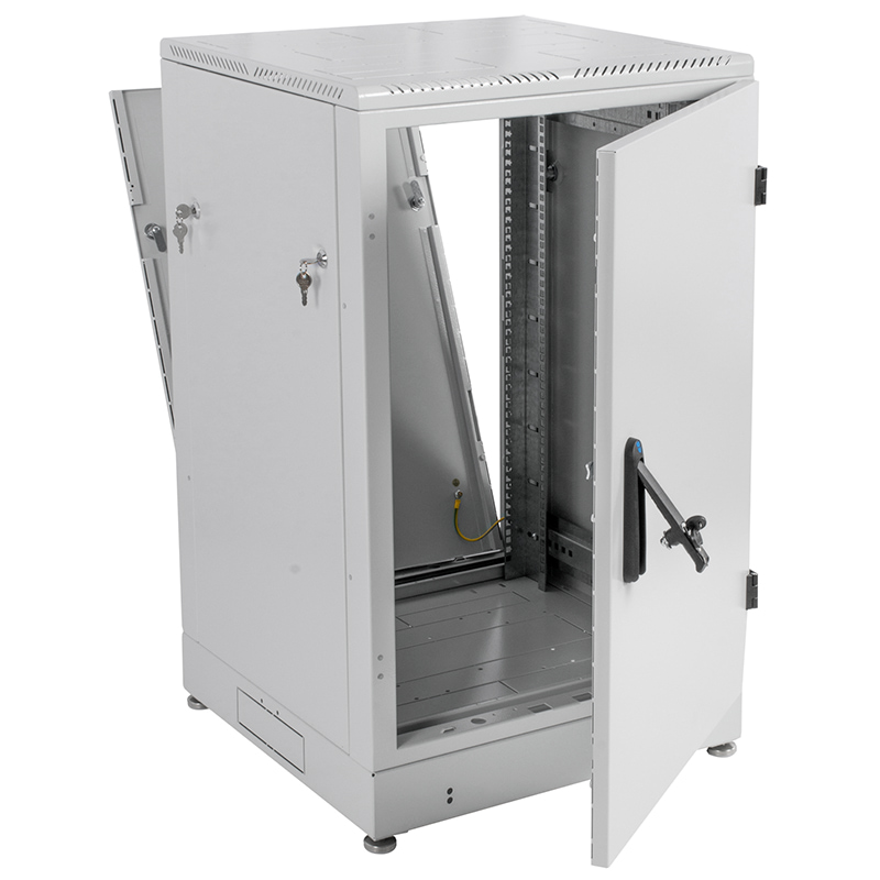 Шкаф имеет разборную каркасную конструкцию. Легок в сборке. Состоит из основания, крыши и двух сварных рам, соединенных комплектом швеллеров. На боковых элементах рамы выполнена дополнительная перфорация под закладные гайки. Шкаф комплектуется задней металлической стенкой и дверью. Двери имеют как правую, так и левую навеску, угол открытия 180 градусов.
