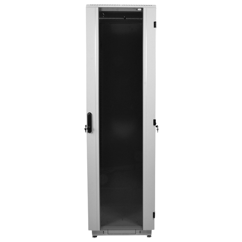 Шкаф имеет разборную каркасную конструкцию. Легок в сборке. Состоит из основания, крыши и двух сварных рам, соединенных комплектом швеллеров. На боковых элементах рамы выполнена дополнительная перфорация под закладные гайки. Шкаф комплектуется задней металлической стенкой и дверью. Дверь имеет как правую, так и левую навеску, угол открытия 180 градусов.