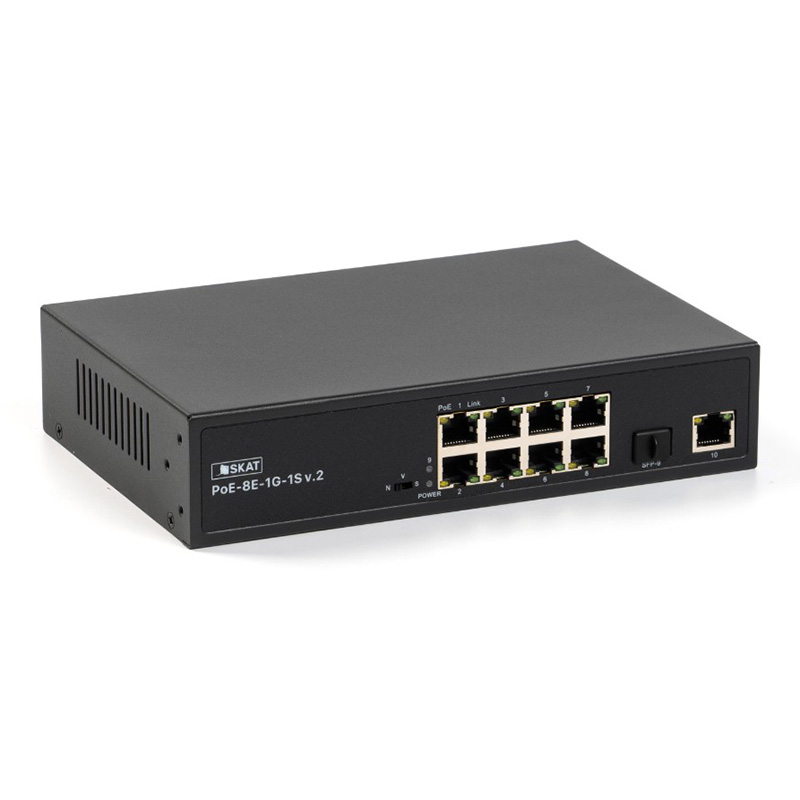 SKAT PoE-8E-1G-1S v.2 – специализированный неуправляемый PoE коммутатор для использования в системах видеонаблюдения и безопасности.