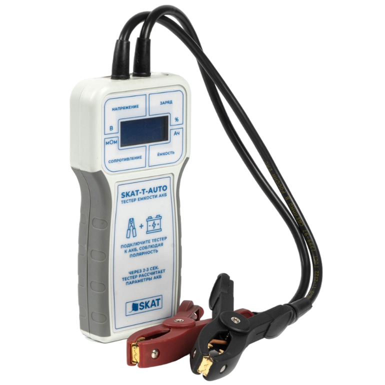 SKAT-T-AUTO – автоматический тестер емкости АКБ, предназначен для оперативной оценки технического состояния свинцово-кислотных аккумуляторных батарей с номинальным напряжением 12В и номинальной емкостью от 0.1 до 120Ач.