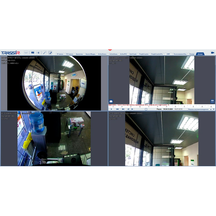 Trassir Dewarp – профессиональное ПО TRASSIR для программного разворачивания изображения Fish-Eye видеокамеры на несколько виртуальных каналов, количество которых задает пользователь. Поддерживает развертку Fish-Eye камер в архиве и работу на любых камерах при значительно сниженном потреблении ресурсов. При раскладке устраняется дисторсия. Функционал позволяет осуществлять PTZ-управление отдельно каждым виртуальным каналом.