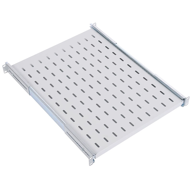 Имеет телескопические направляющие, обеспечивающие плавное выдвижение. Монтажные кронштейны фиксируют полку к вертикальным направляющим шкафов и стоек в 4 местах. Глубина монтажных кронштейнов регулируется, что позволяет устанавливать полку на необходимую глубину.