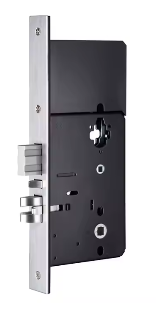 Замок комплектуется только одним типом ANSI-мортизы и позволяет запирать дверь в автоматическом режиме на косой ригель с «антиотжимным» язычком. Запор на прямой ригель возможен только изнутри в ручном режиме. ANSI-мортиза имеет уголковый фиксатор для фиксации двери в дверном проеме ( эта функция позволяет исключить вибрацию двери при сквозняках) .