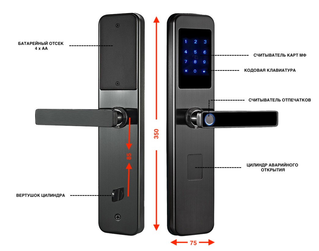 Замок предназначен для работы с любыми запорными механизмами с межосевым расстоянием 85 мм ( в этом режиме на двери меняются только ручки и электроника управляет только защелкой, для управления ригелями используйте обычный ключ ). Если вы хотите полное управление ригелями — мы предложим вам оптимальный запорный механизм под вашу дверь и вы сможете выдвигать ригеля поднятием ручки вверх.