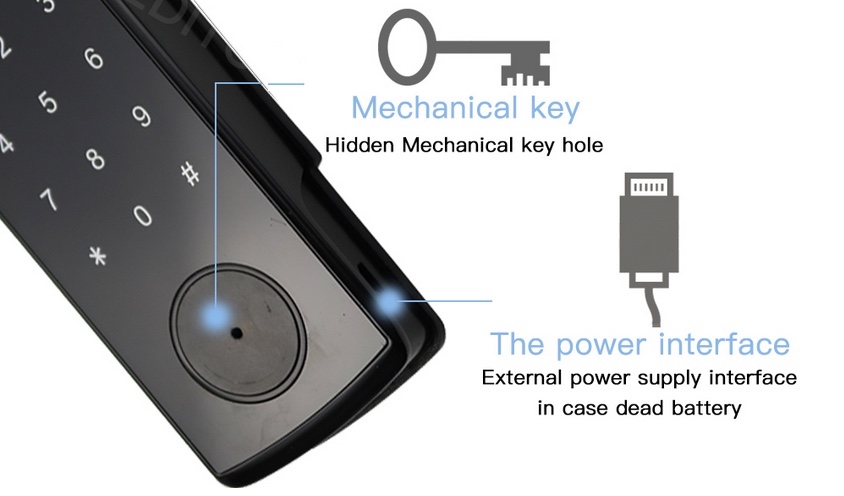 Подать питание можно через разъем Micro USB, который расположен на наружной части замка. Это можно сделать либо через обычный блок питания мобильного телефона либо от внешнего аккумулятора (типа Power Bank).