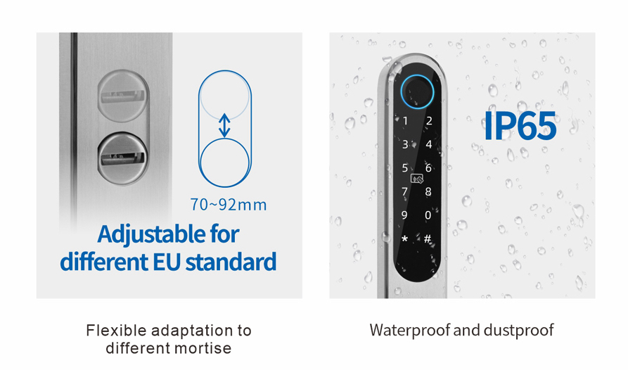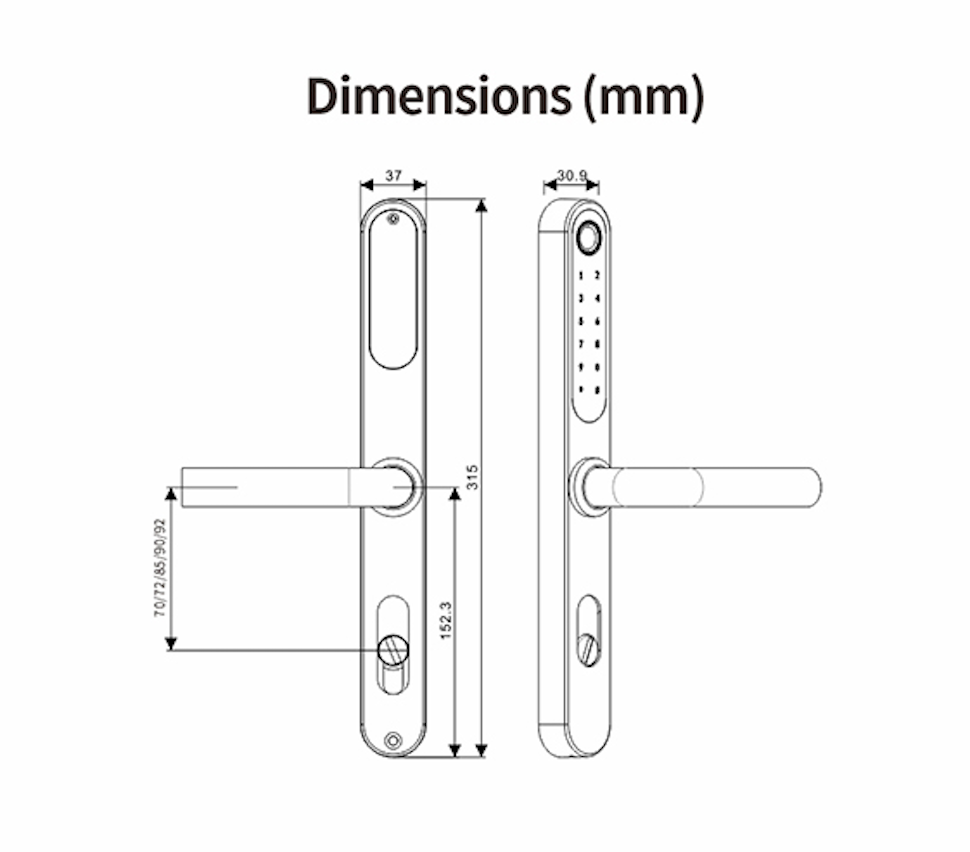 Узкий всепогодный смарт-замок с отверстиями под установку стандартного евро-цилиндра и удобными для ввода кода кнопками. Ручки можно устанавливать на любой запорный механизм с межосевым расстоянием 72/85/92мм.