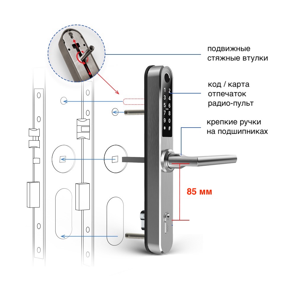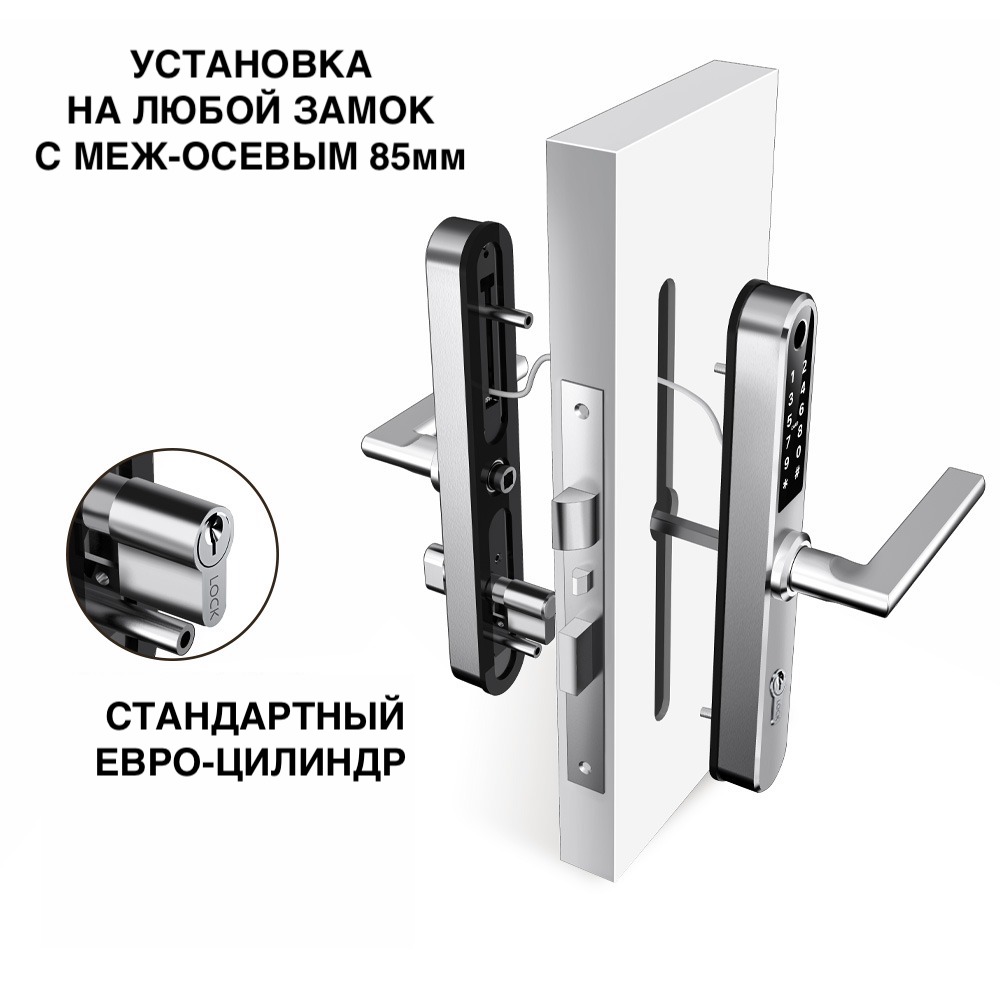 Узкий всепогодный смарт-замок с отверстиями под установку стандартного евро-цилиндра. Ручки можно устанавливать на любой запорный механизм с межосевым расстоянием 85 мм — в этом случае электроника будет управлять защелкой, а цилиндр — ригелями. Также возможна установка на «наши» мортизы с запиранием «ручкой вверх».
