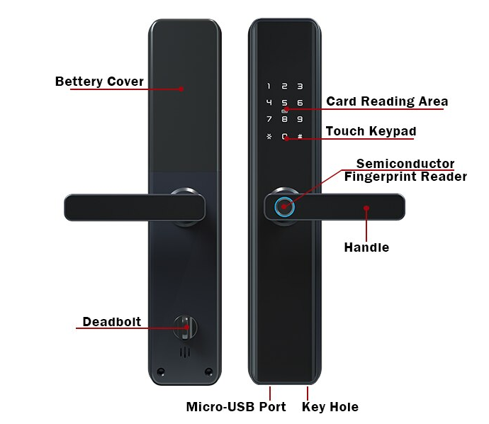Подать питание можно через разъем Micro USB, который расположен на наружной части замка. Это можно сделать либо через обычный блок питания мобильного телефона либо от внешнего аккумулятора (типа Power Bank).