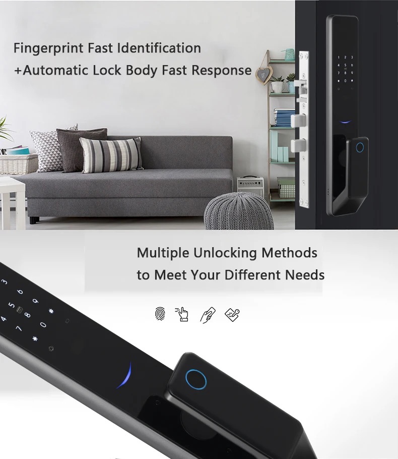 Крупный биометрический замок для установки на массивные входные и межкомнатные двери без нажимной ручки.
