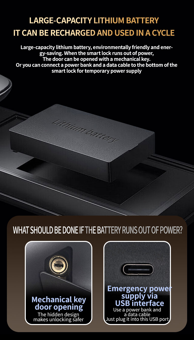 Подать питание можно через разъем TYPE-C USB, который расположен на наружной части замка. Это можно сделать либо через обычный блок питания мобильного телефона либо от внешнего аккумулятора (типа Power Bank).