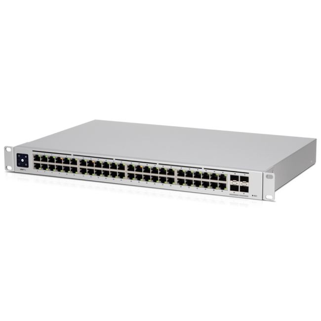 UniFi Switch 48 PRO – управляемый коммутатор, обладающий 48 гигабитными Ethernet-портами и 4 10-гигабитными портами SFP+. В дополнение к Layer 2, коммутатор предлагает функции Layer 3, такие как маршрутизация Inter-VLAN, статичная маршрутизация и функциональность DHCP-сервера.