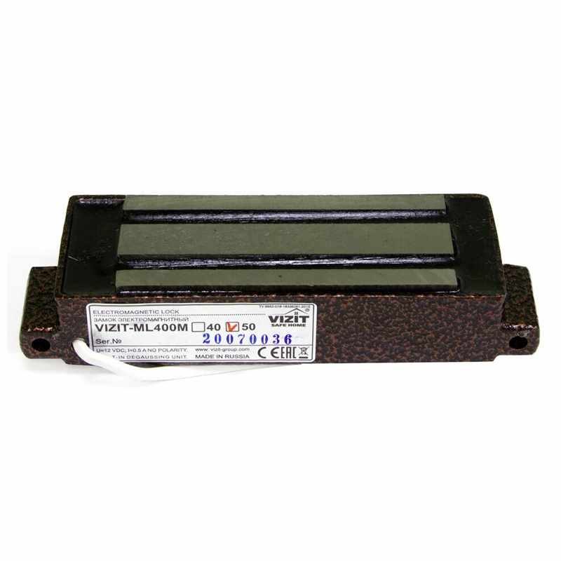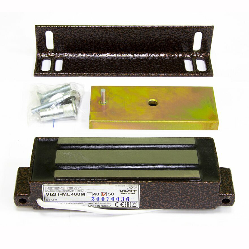 VIZIT-ML400M-40-50-4 – электромагнитный замок, представляет собой корпус с электромагнитом и ответную металлическую пластину, а также монтажный уголок толщиной 4 мм.