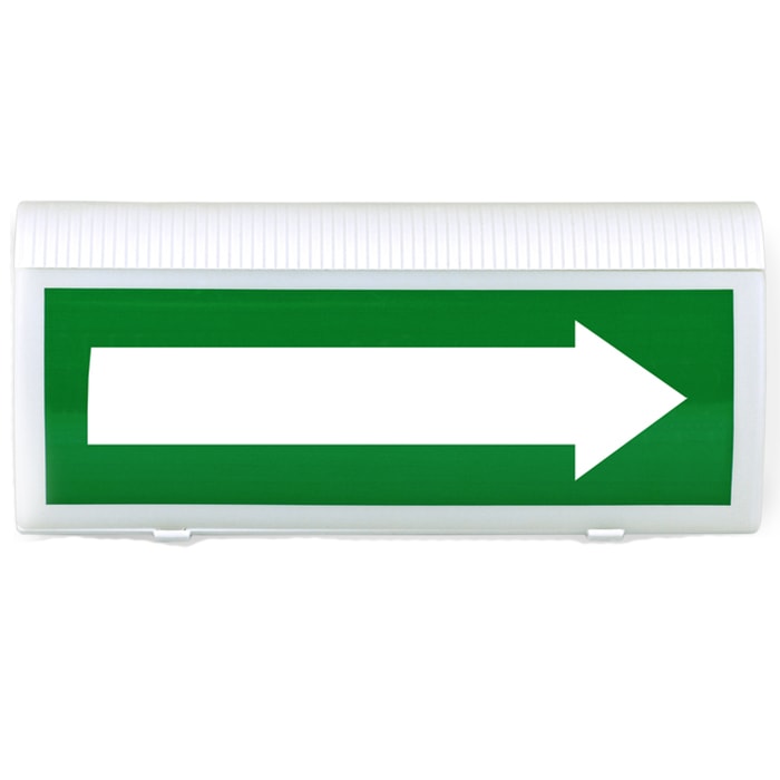 При пожаре оповещатель подсвечивает табло с указателем «СТРЕЛКА ВПРАВО» мигающим белым светом, информируя окружающих о пожарной тревоге и необходимости покинуть помещение по направлению в соответствии с указателем.